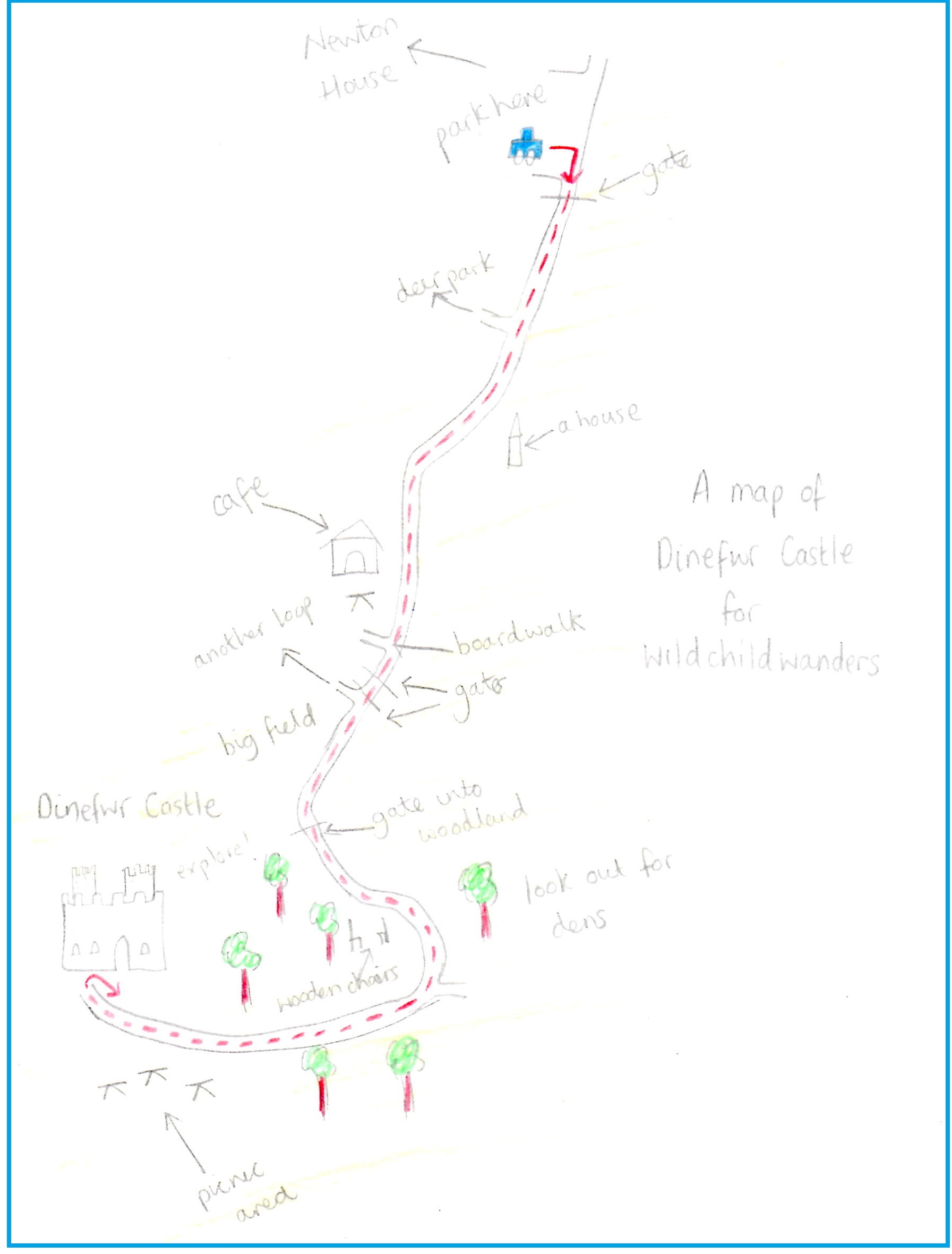 When you can drag your adventurers away head back to the car the way you came up; remembering to turn left at this junction in the woods.