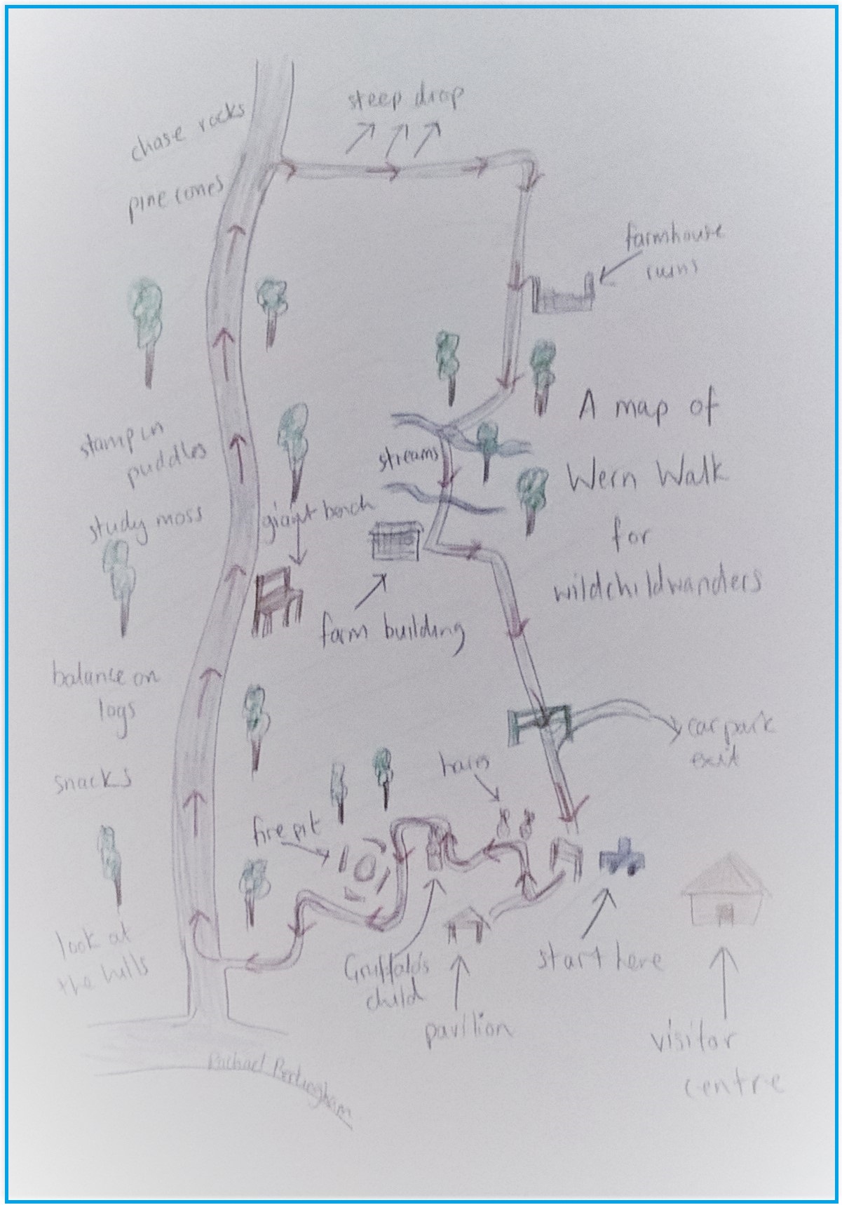 The Wern walk is a well surfaced, way-marked, forestry wander that begins and ends at the Garwnant Visitor Centre. It takes you both through trees and along a more exposed track so make sure you wear layers if it’s wet or windy. The distance means that younger adventurers may need a break or a short ride in a carrier to rest their legs. However, the terrain is not challenging and would suit off-road pushchairs (as long as you don’t mind going though a stream…) At the visitor centre there is parking, a cafe and a playground as well as a much shorter 1/4 mile puzzle trail.