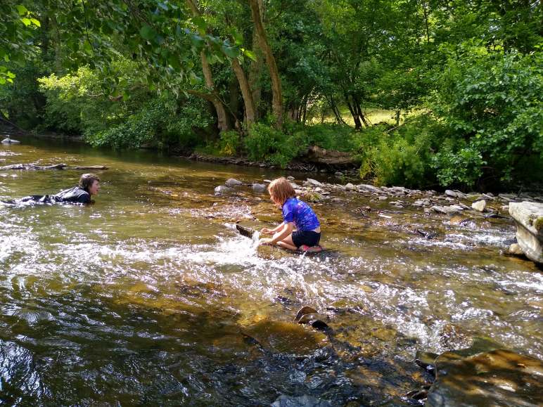 Go over the not-so-shaky bridge and follow the worn path across the field towards the trees. There are some lovely beachy areas along the river for little legs to paddle when the river is low and slow.