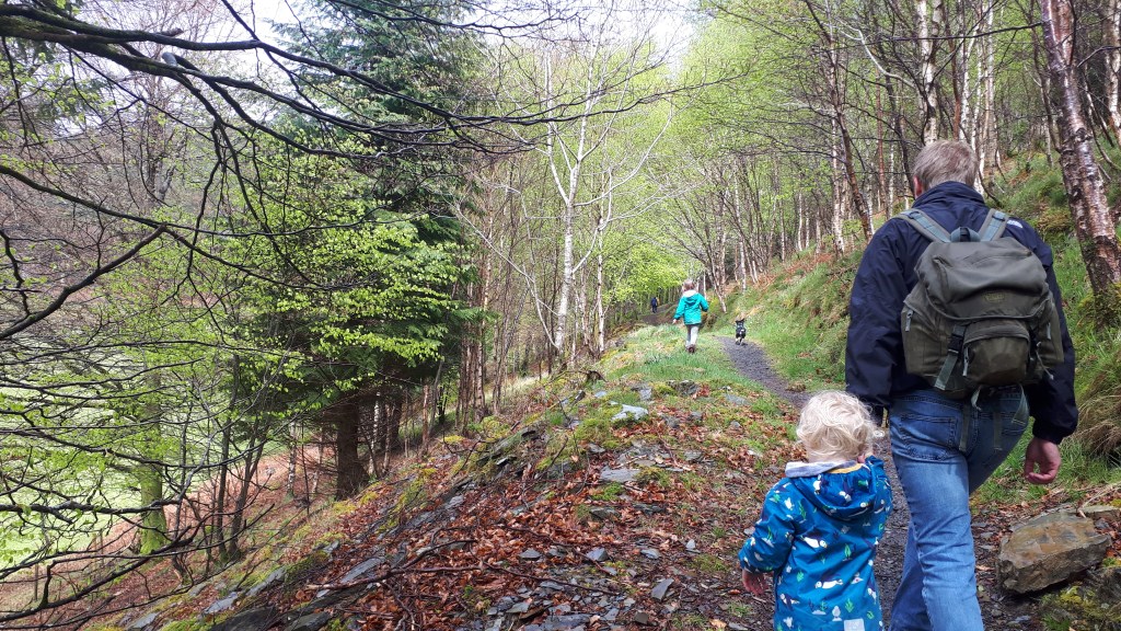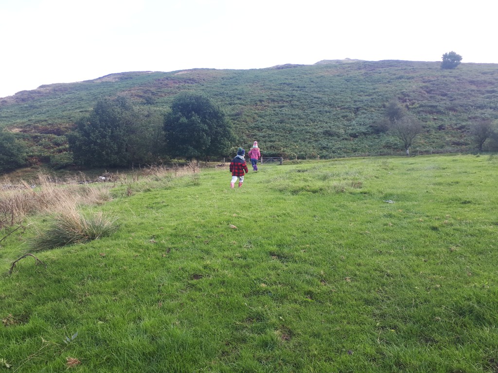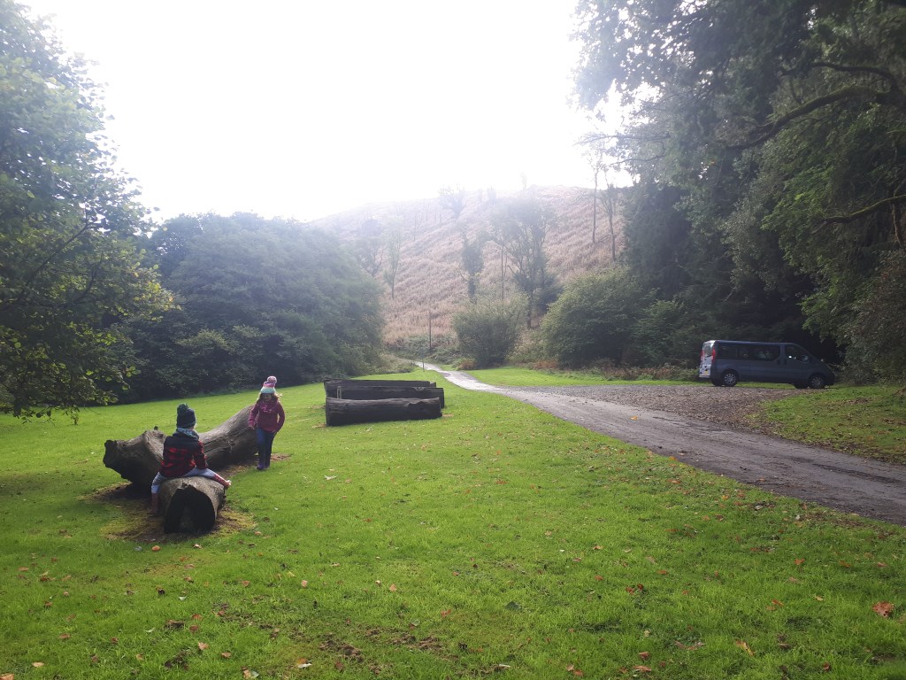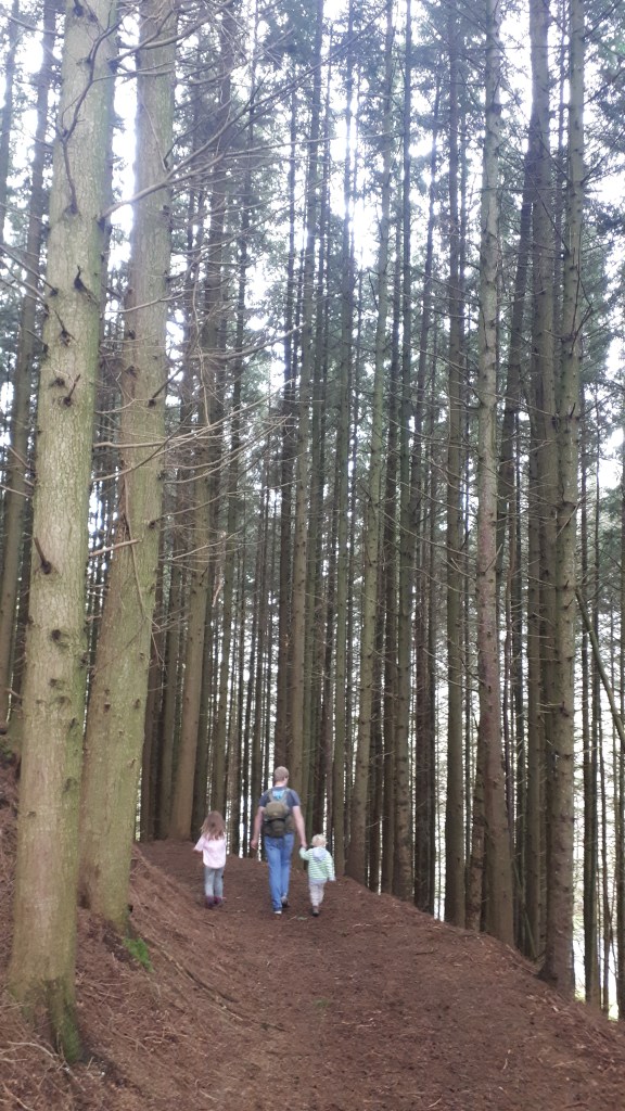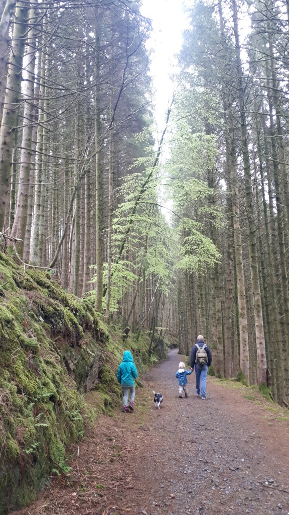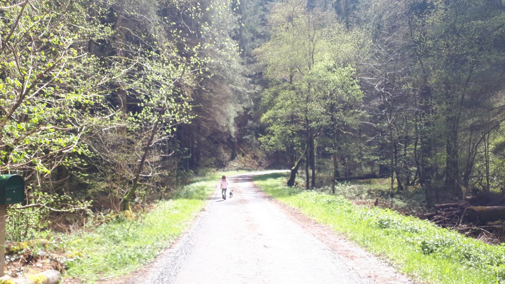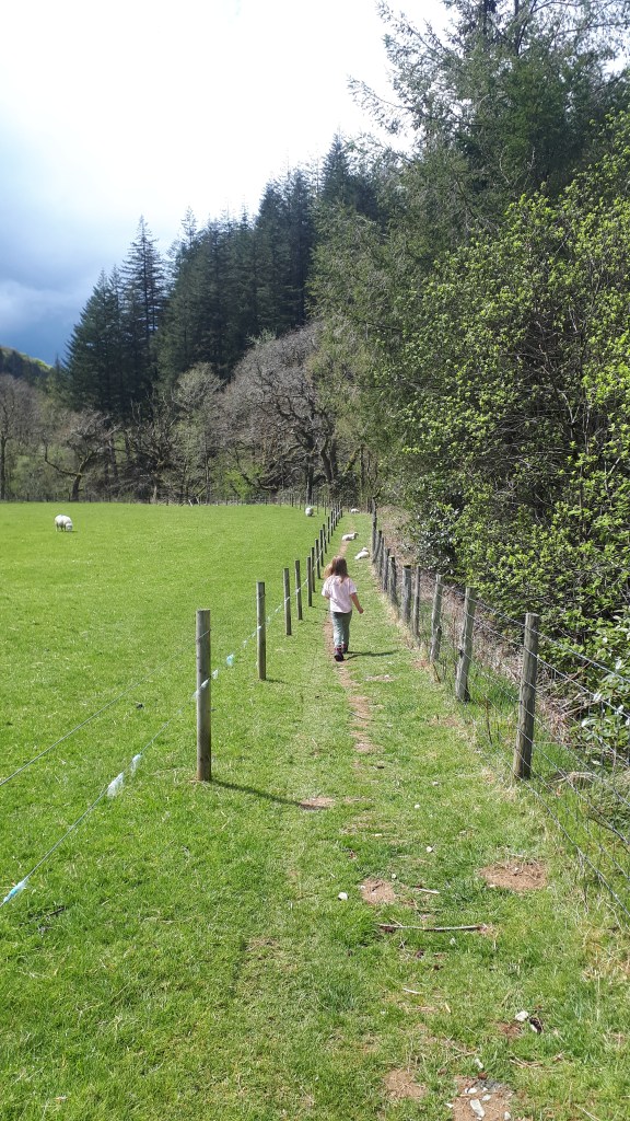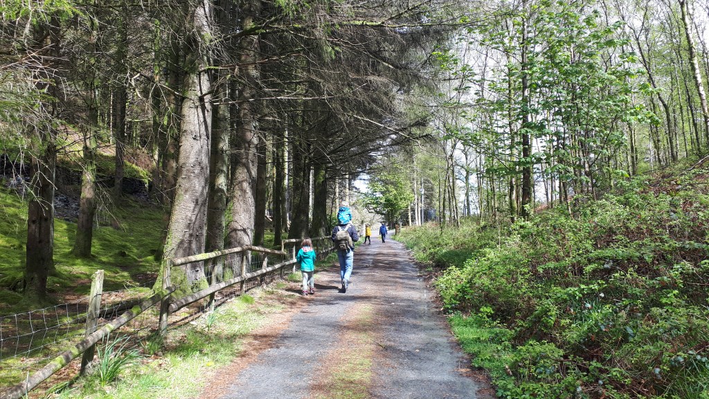 Follow the trail through a grassy field and onto a wide track – we did come across some forestry vehicles here so be vigilant.