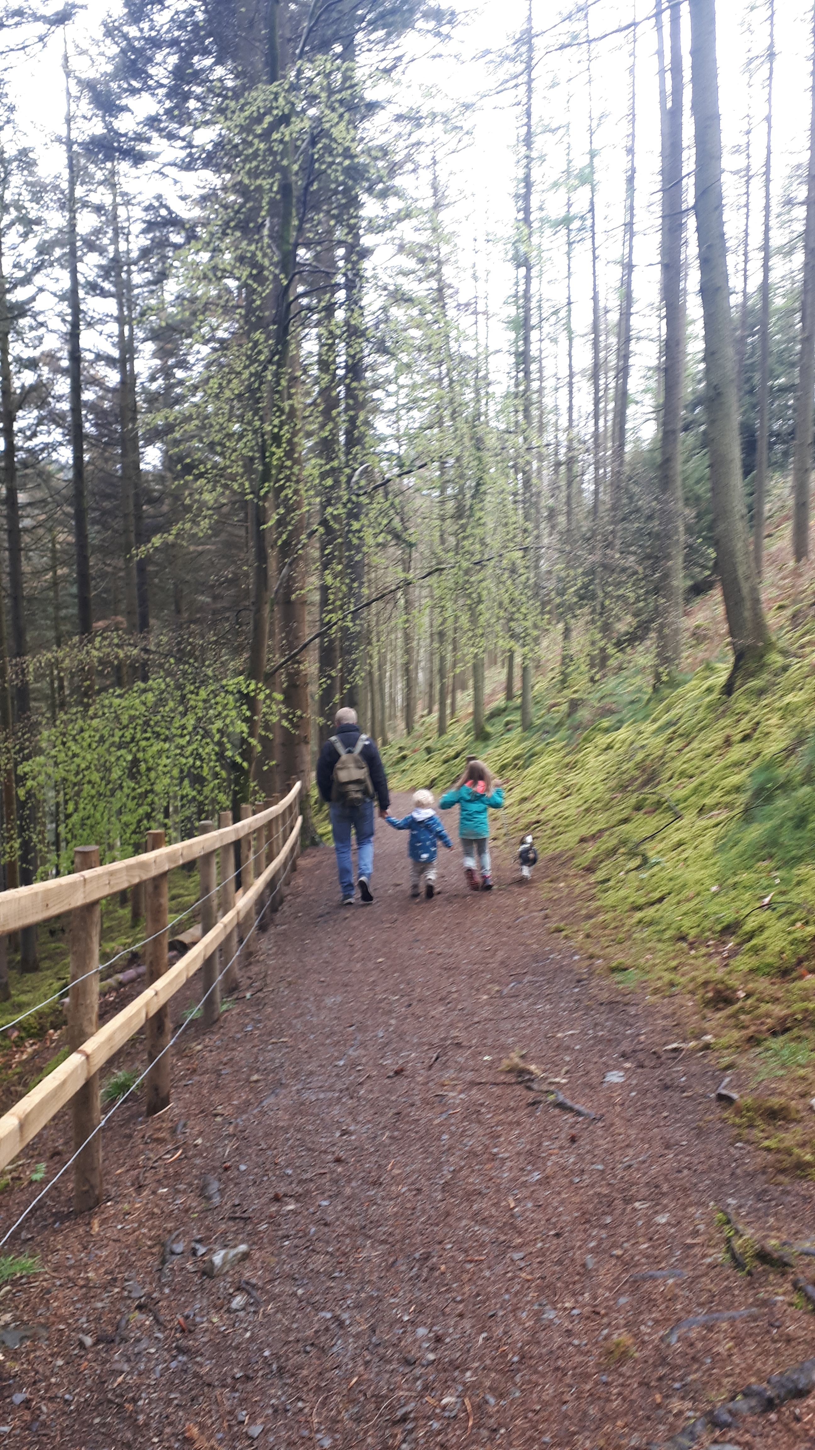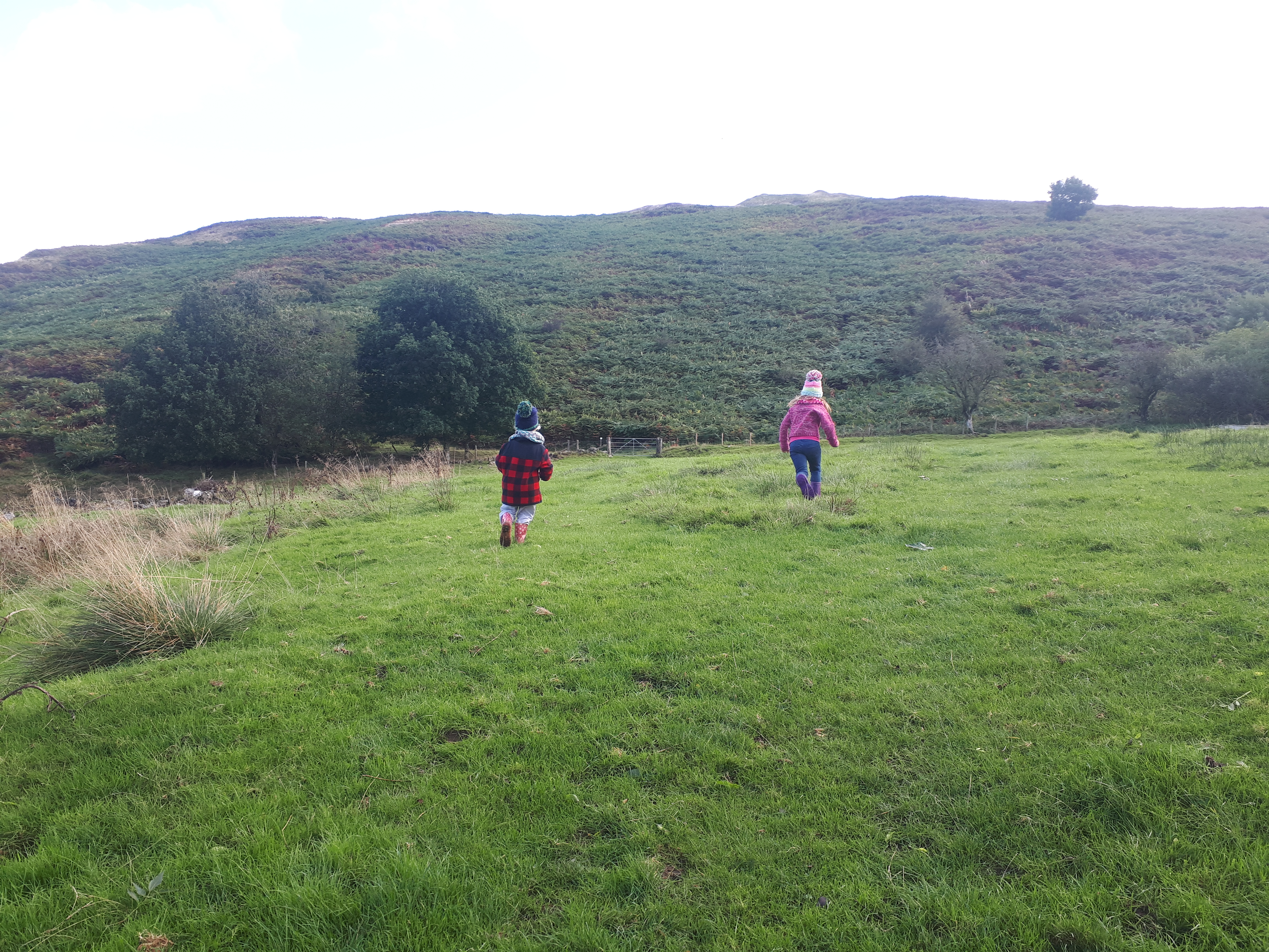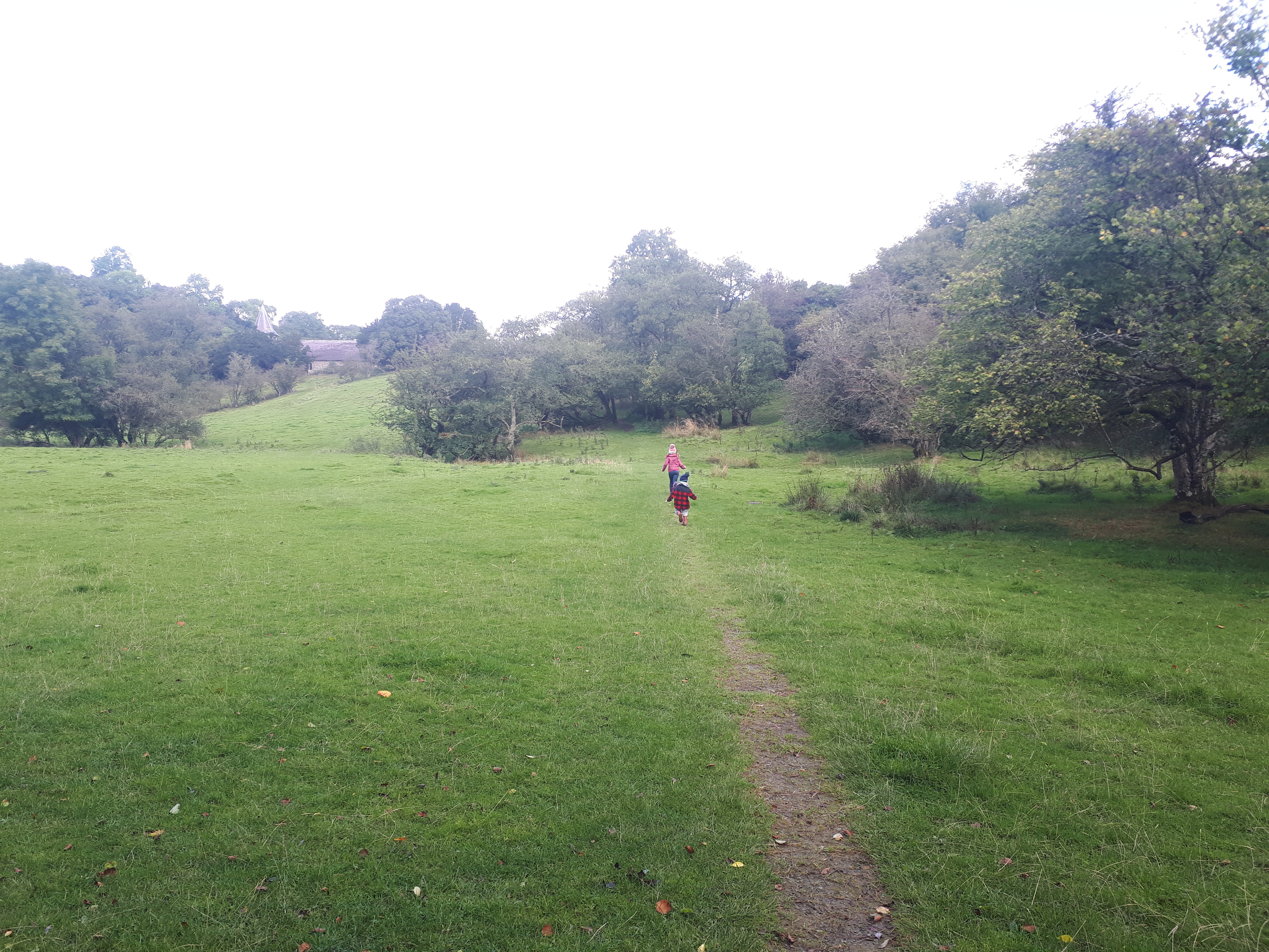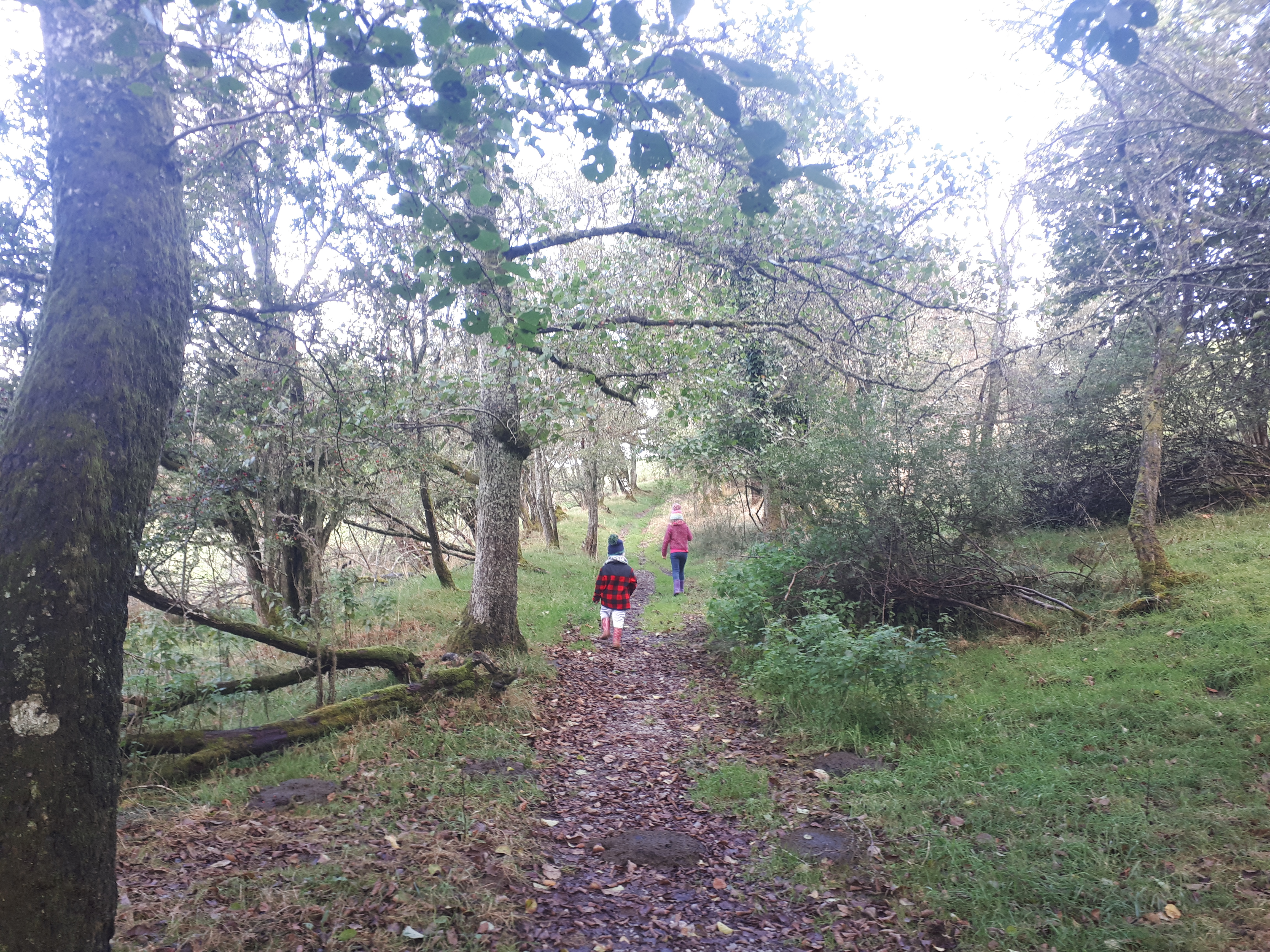 Follow the trail through a grassy field and onto a wide track – we did come across some forestry vehicles here so be vigilant.