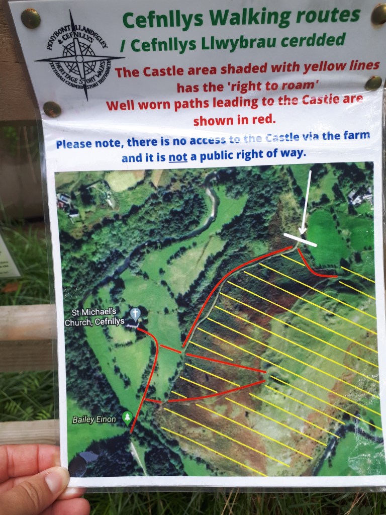 This site also features in the Penybont, Landegley & Cefnllys Heritage Story Walks. The aerial photo shows the boundaries of the common land and some well worn paths to Cefnllys Castle – we followed the least steep route!