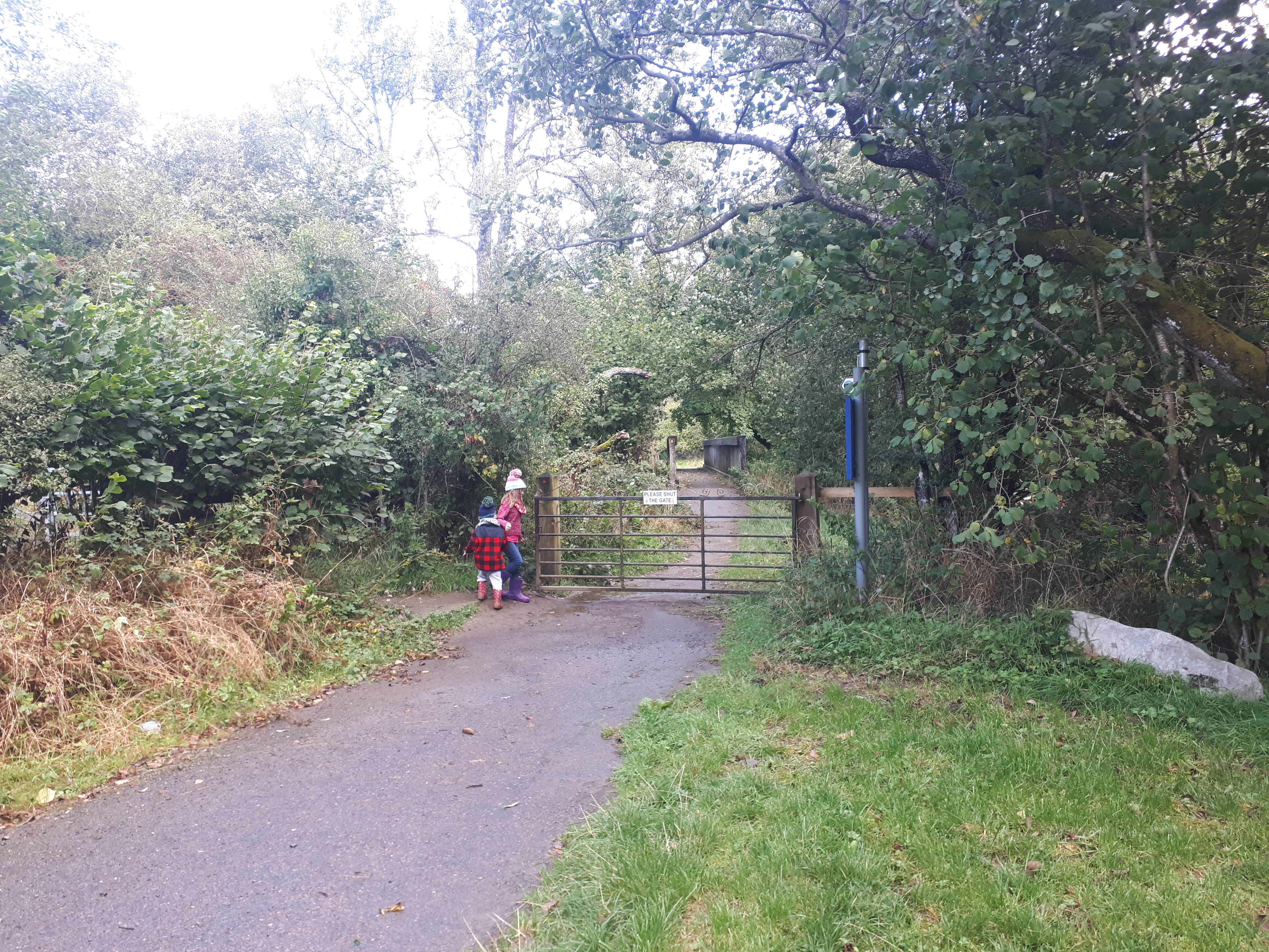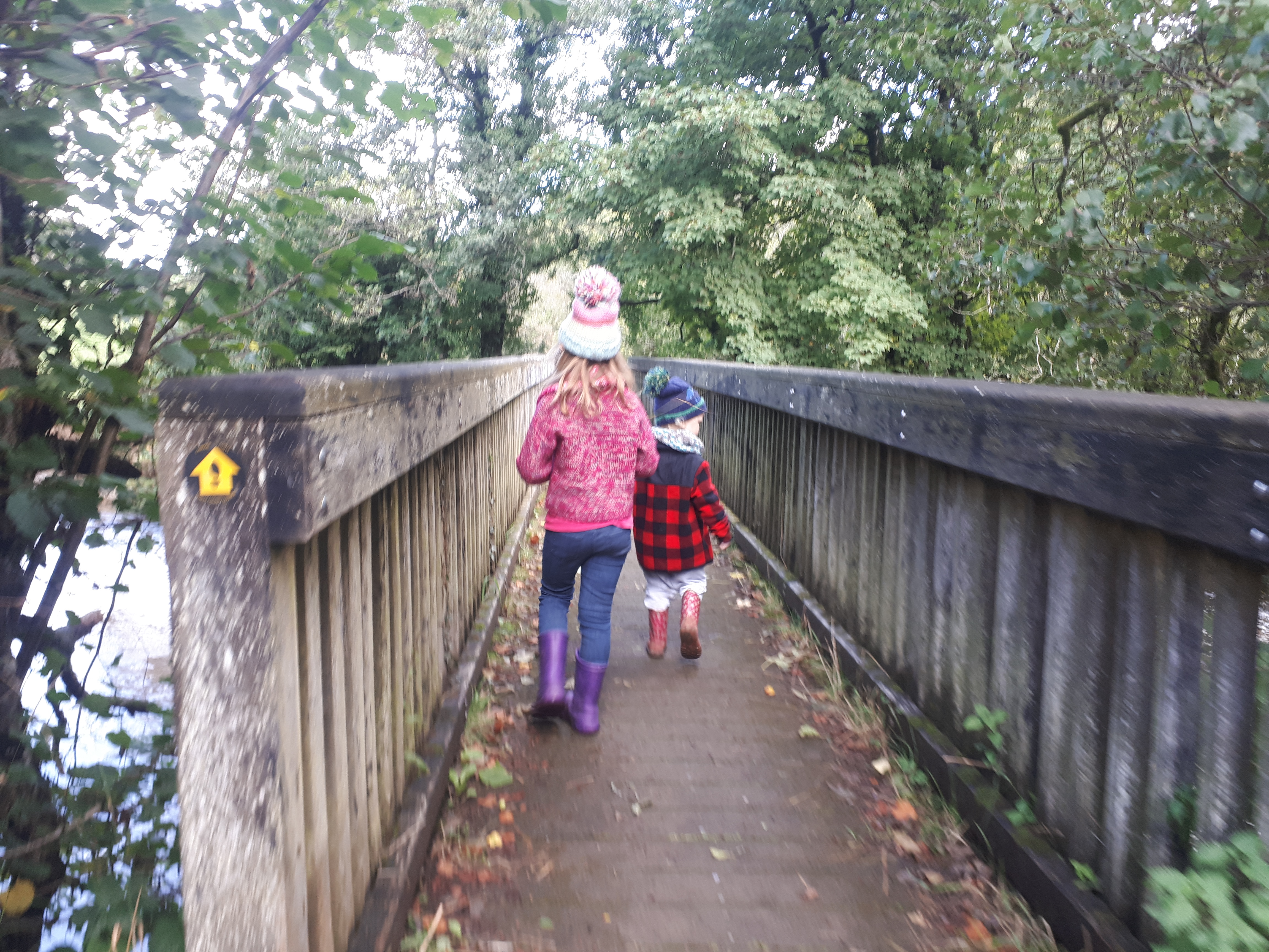 Follow the stoney track back down the hill, through the gate, across the field, through the trees and towards the bridge. There are lots of blackberries to snack on at the right time of year.