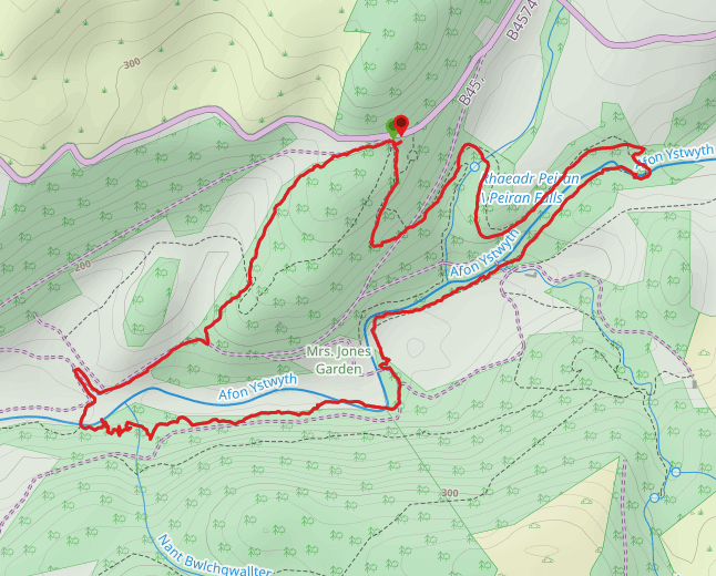 Start your wander from the carpark, clearly signposted from the road. Here you will find detailed guides to the area and paper maps for sale. Follow the signs for the Ystwyth Gorge Walk – the green arrows.